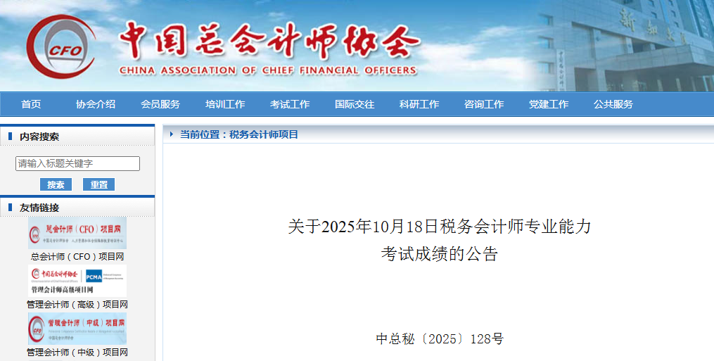 根据税务会计师专业能力考试等有关规定,现将2025年10月18日税务会计师专业能力考试成绩在中国总会计师协会(以下简称中总协)官网(www.cacfo.com)公布。相关事项公告如下: